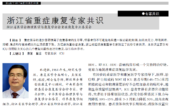 2017 年,我院林建强院长主导、省内知名专家共同参与,在国内首次制定并发表了重症 康复方面的专家共识——《浙江省重症康复专家共识》,该《共识》不但为浙江省重症 康复医学建设提供了指南,也为全国重症康复领域的发展方向提供了理论依据。